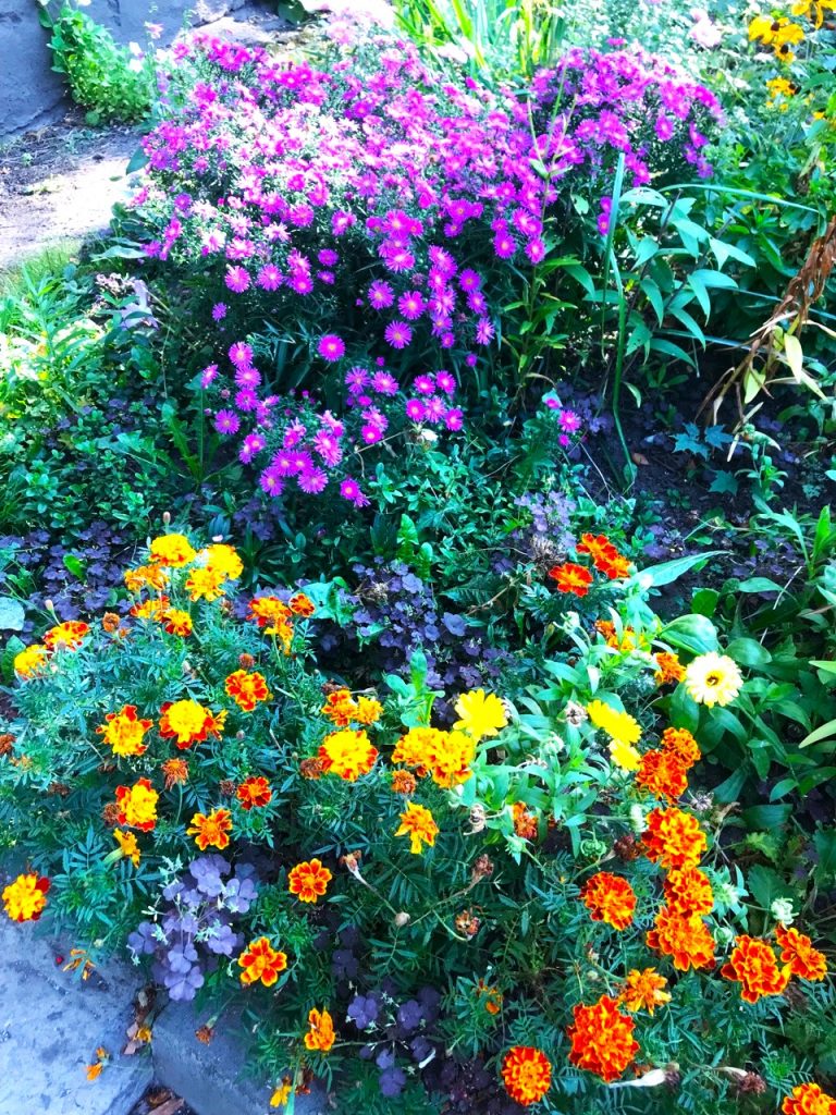 А рядом с ними яркие осенние краски нам дарят желто-оранжевые бархатцы и сине-фиолетовые брахикомы, которые иногда называют “австралийскими незабудками”.