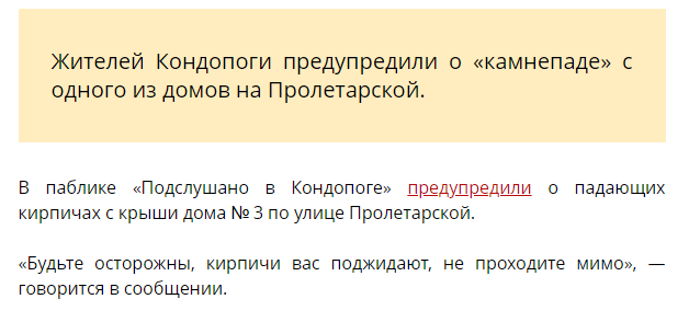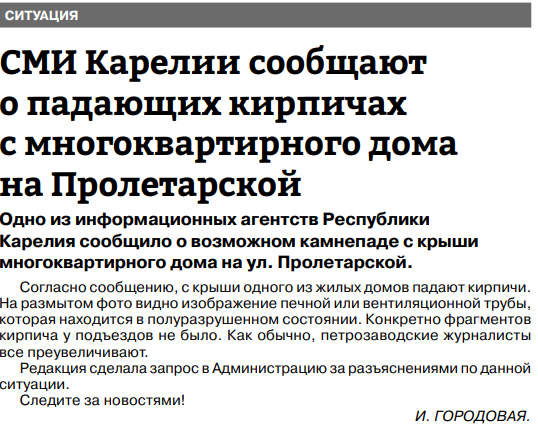 7 июля на республиканском сайте «Столица на Онего» была опубликована заметка о падающих кирпичах с кровли д. 3 по ул. Пролетарской. 13 июля, со ссылкой на этот информационный ресурс, была напечатана заметка «СМИ Карелии сообщают о падающих кирпичах с многоквартирного дома на Пролетарской».