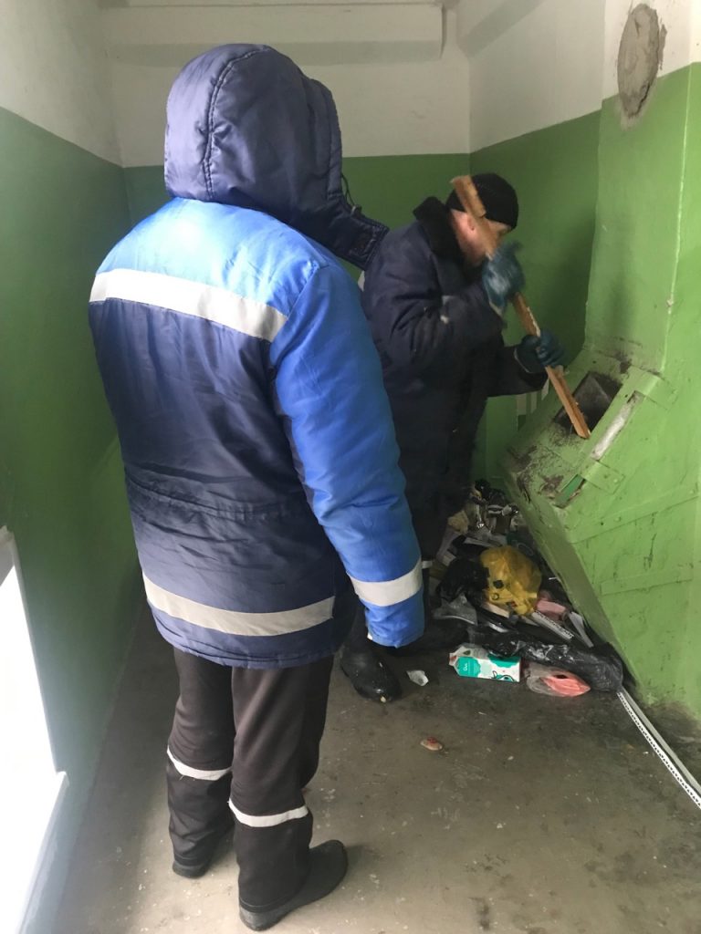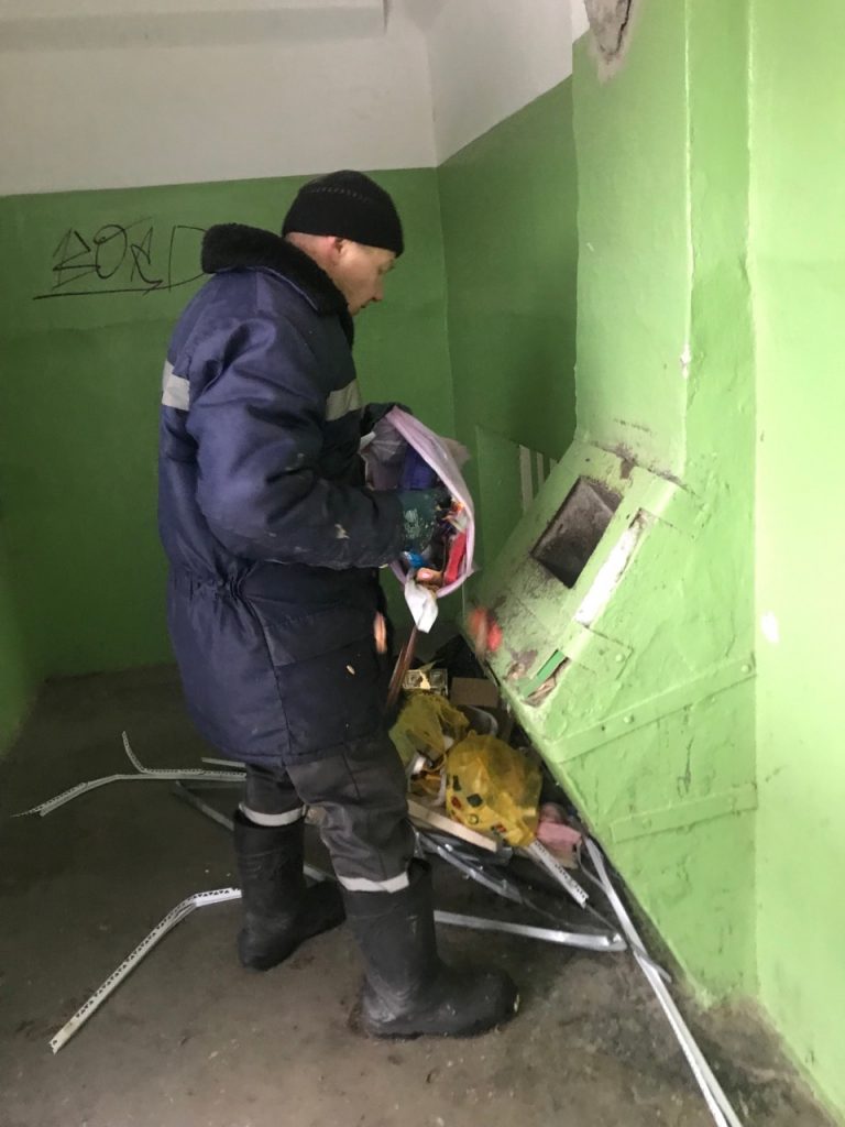 1 марта работникам участка благоустройства пришлось вновь устранять сложный засор мусоропровода во втором подъезде д. 77 по Октябрьскому шоссе. Затор возник между вторым и первым этажами.