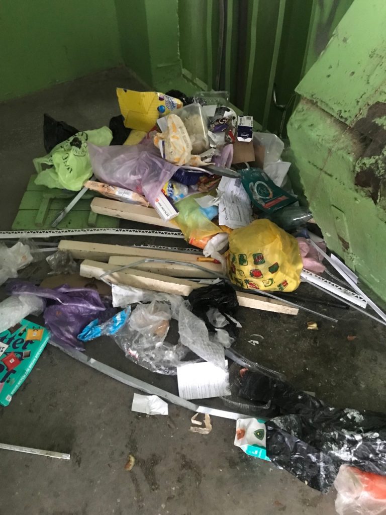 Если в феврале в первом подъезде д. 15а по ул. Советов причиной подобного засора стали строительные отходы: кусок водопроводной трубы и огромный рулон плотной упаковочной бумаги, то на этот раз в мусоропроводе были обнаружены рулон утепленного наматрасника, деревянные ножки от кухонного стола, двухметровые металлические уголки. Это как же еще надо постараться, чтобы затолкать все это в загрузочный клапан! Вот что лень-матушка делает с людьми, которым трудно донести свои отходы до контейнерной площадки.