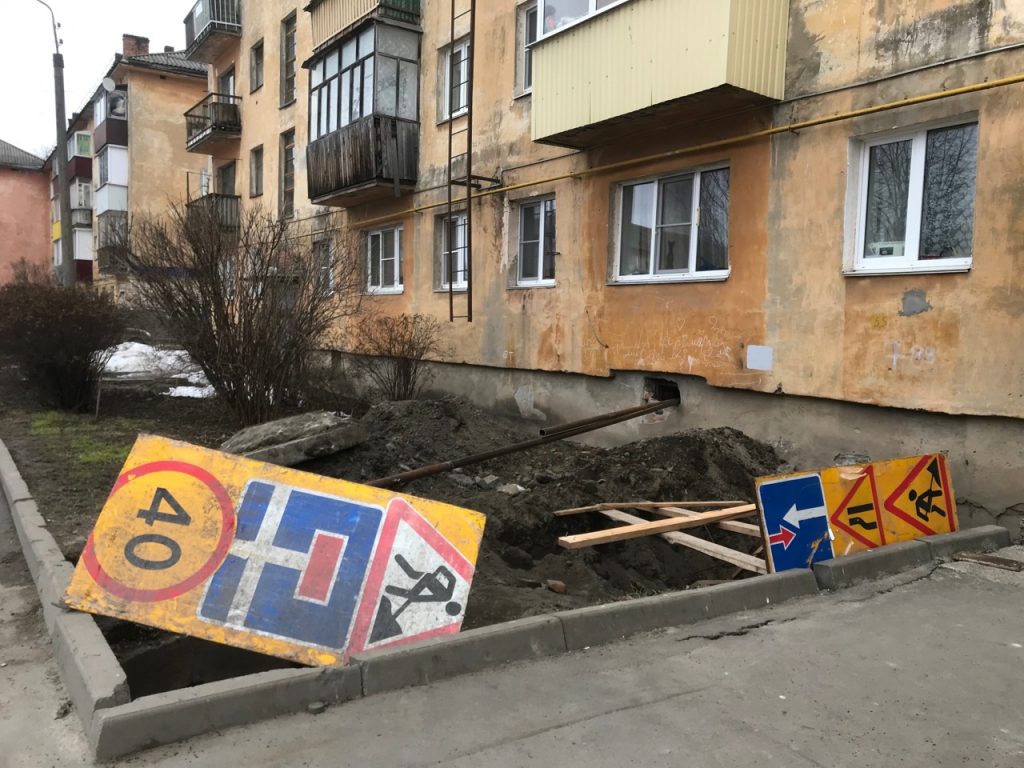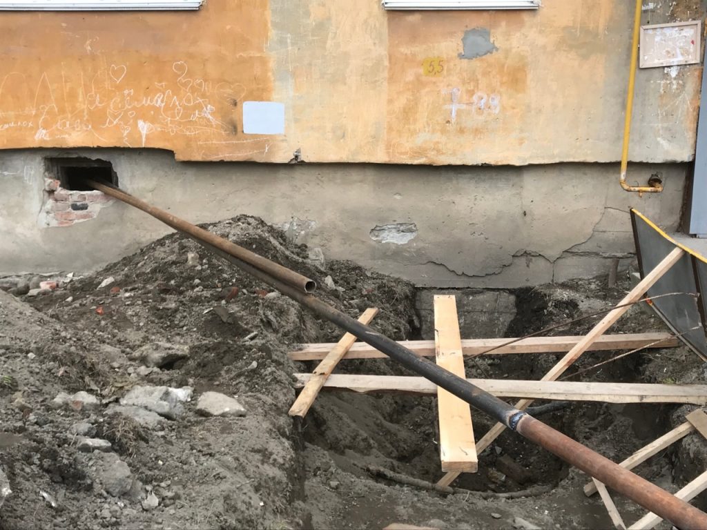 Ремонтные работы на этом участке осложнились наличием четырех кабелей, поэтому они будут продолжены позже. Для этого потребуется пробить отверстие в стене, а старые трубы заменить на новые ПНД (полиэтилен низкого давления), а потом, как положено, закопать. Чтобы не прекращать в дом подачу горячей воды, через слуховое окно подвала проведена воздушная линия в качестве временного варианта. Завершить все работы планируется до конца недели.