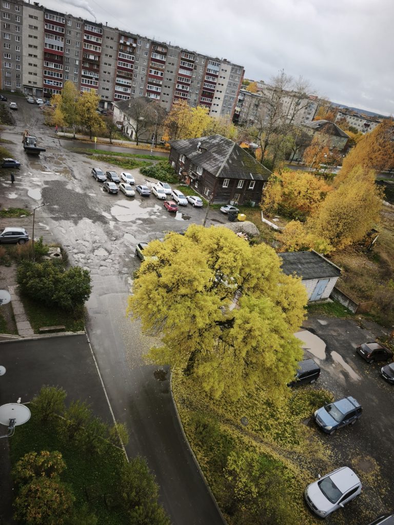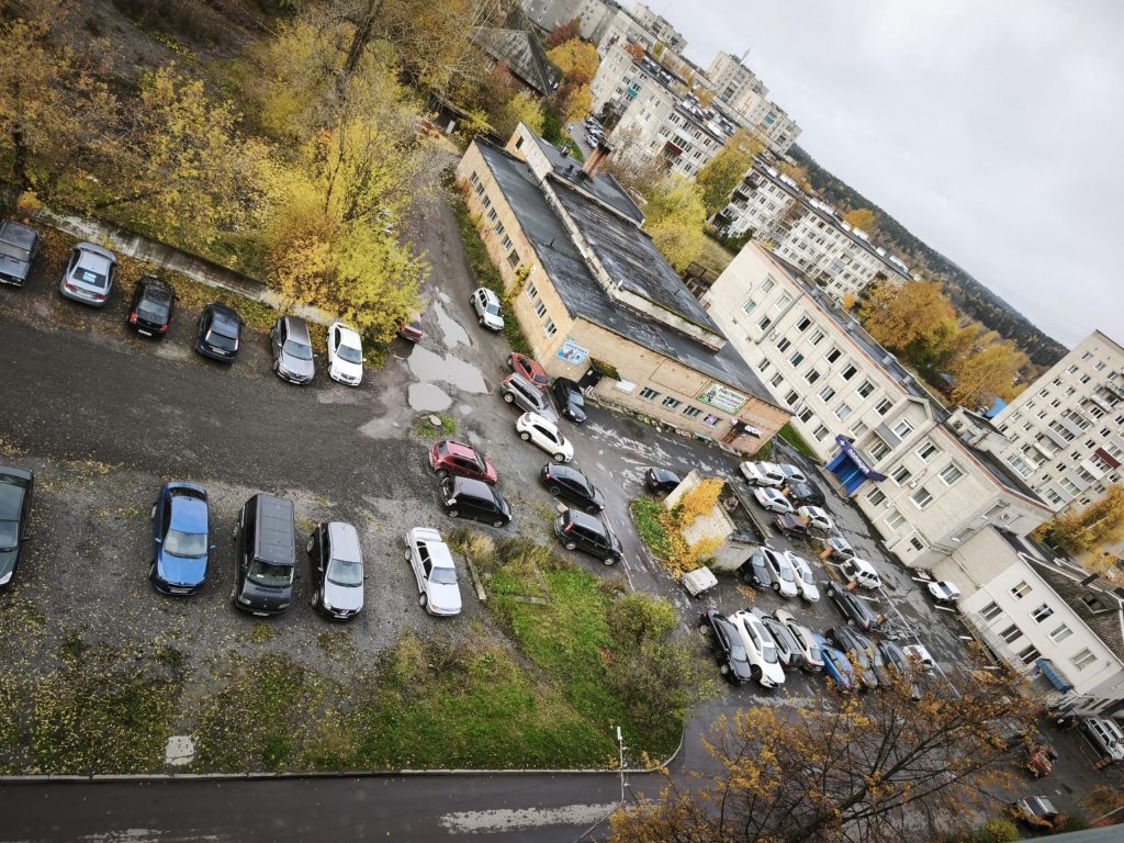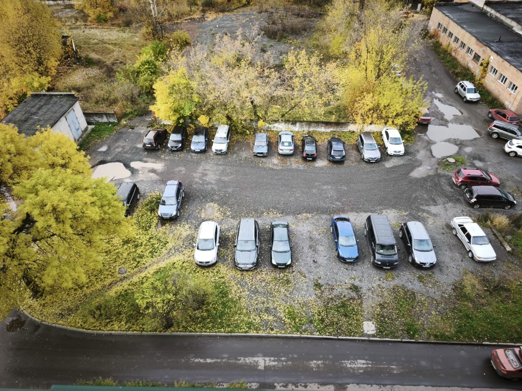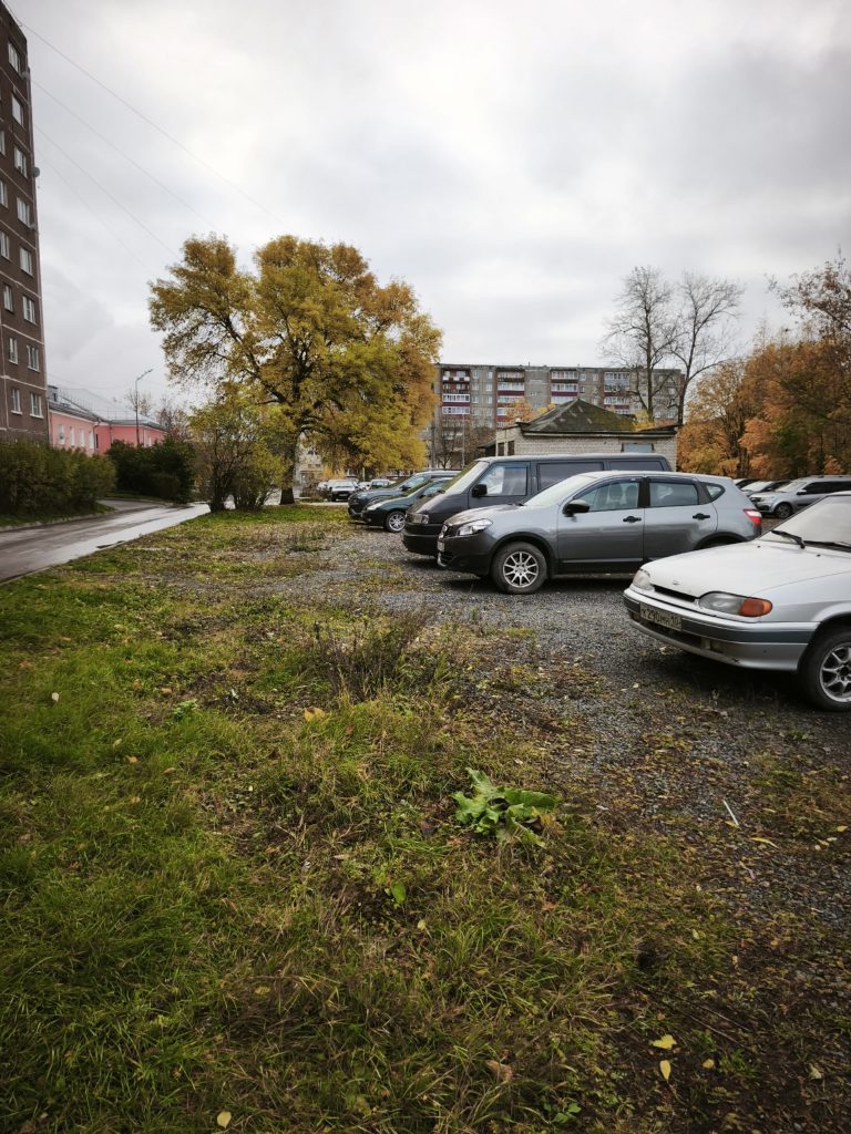 Далее трасса пойдет вдоль этого дома. Сначала через автостоянку и зеленую зону, не затрагивая заасфальтированного дворового проезда.