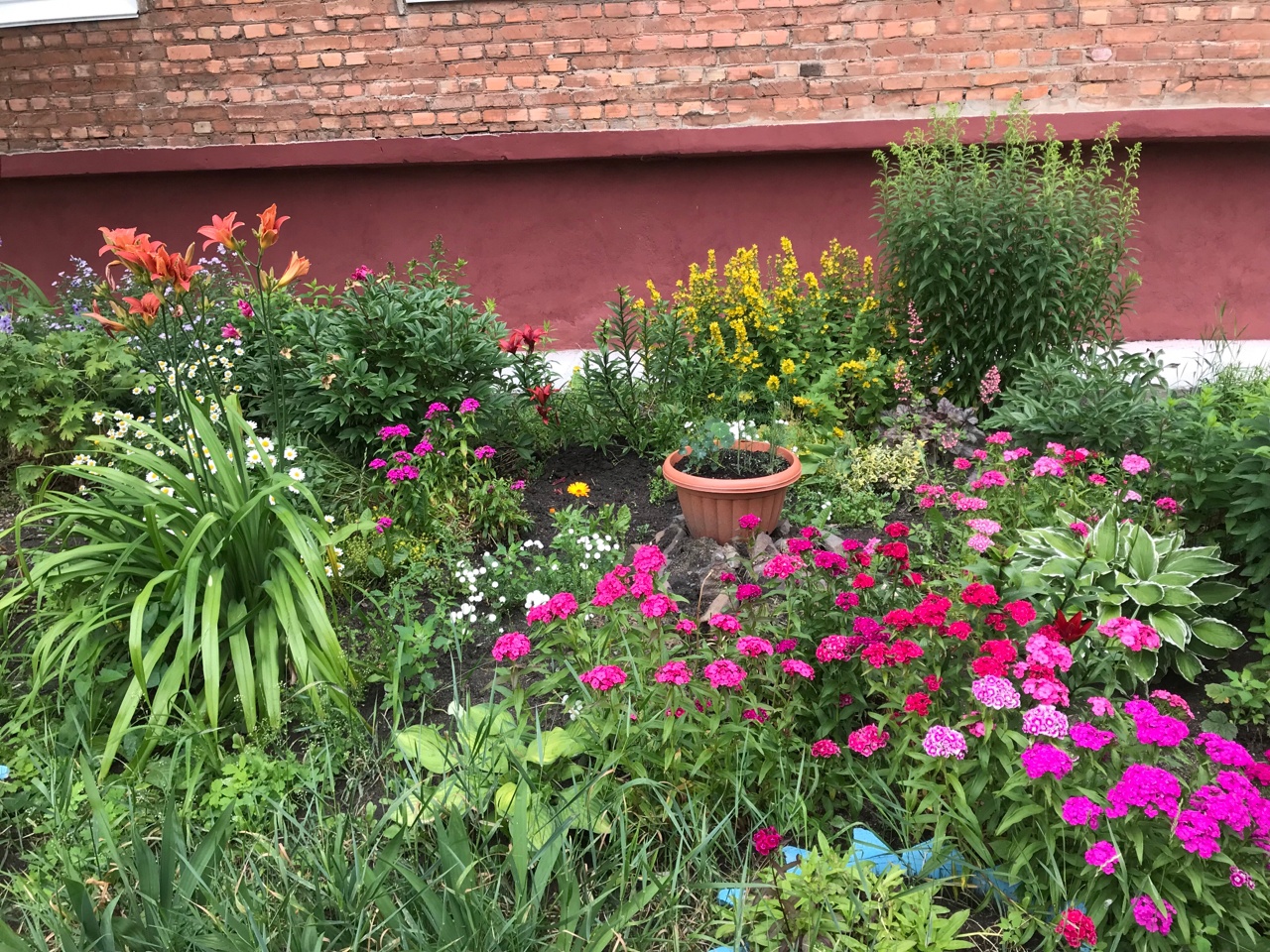 Вот и потеплело на улице, хотя еще вчера погода не баловала. Начало июля вообще выдалось прохладным и дождливым, и лишь цветочные палисадники во дворах не давали забывать, что мы приближаемся к макушке лета. Сезон первоцветов уже завершен — отцвели нарциссы и тюльпаны, доцветают лилии и ирисы, зато набирают цвет садовые гвоздики, что мы обнаружили на газоне у второго подъезда д. 5а по ул. Комсомольской.